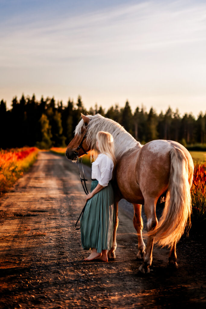 This pose is not only amazing to get the session started in a relaxed way, but it can also act as a great way to provide the more restless horses a break in between all the standing still. All you have to do is walk away from the camera, and then straight back towards me. Stay beside your horse, so you can interact – for example by giving scratches. Every now and then I might ask you to peek at the camera from over your shoulder when walking away from me!