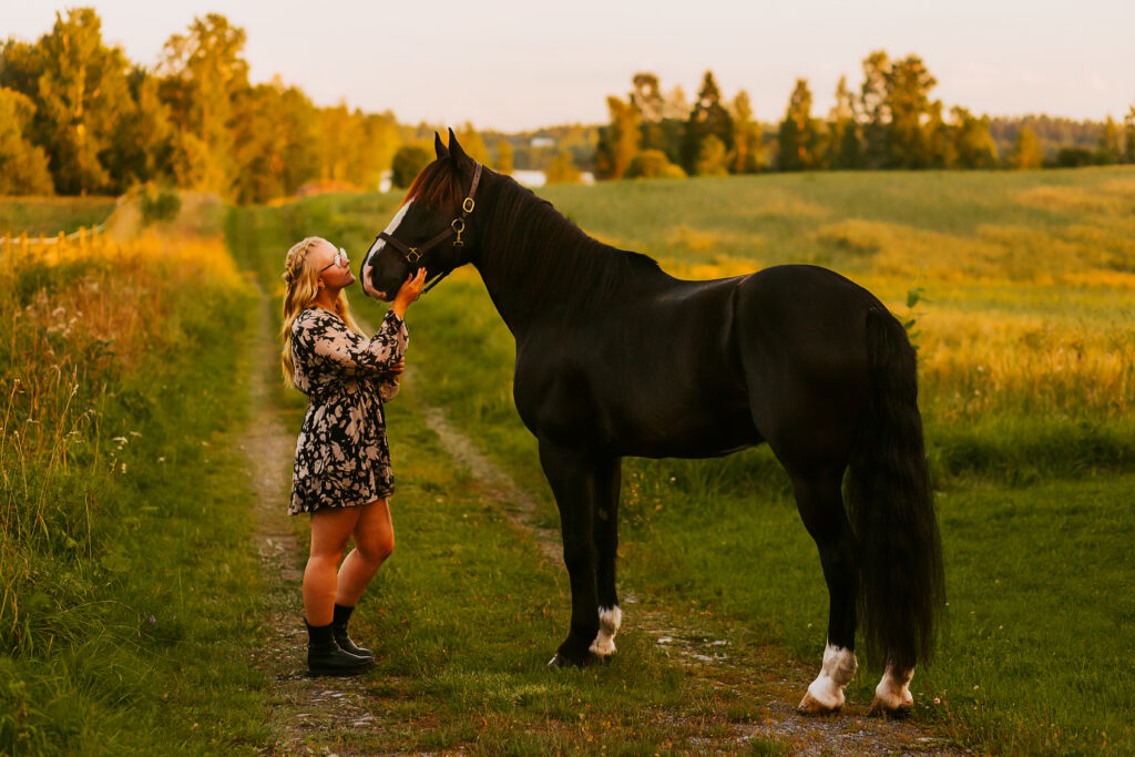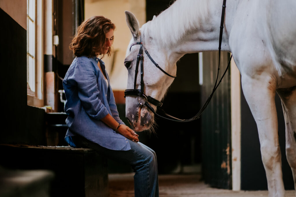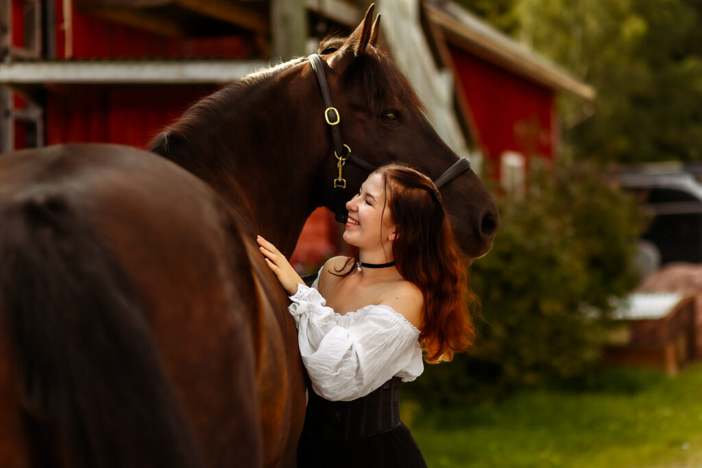 This pose can make for some very special images! If the setting is right in terms of the energy levels and cooperation of the horse, you will want to sit down on a safe surface (i.e., tack box, bench, hay bale). Only if your horse is extremely calm and you are 100% confident in it being safe, should you sit on the ground at a distance where your horse’s nose can reach you. I always encourage a little “stretching the neck required” -space to make sure you are being safe. Once in a comfortable position, we can go for a variety of poses and interactions with your horse. Kisses on the nose, looking up with a big smile, looking into the distance while still physically connecting. I also love to make use of any long grass or other environmental features I can find to bring in some extra interest.